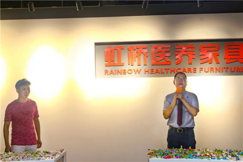 揭牌儀式由虹橋醫(yī)養(yǎng)家具事業(yè)部總經(jīng)理朱慧敏主持,虹橋董事總經(jīng)理左伯良與虹橋總顧問(wèn)周本泉博士共同為儀式剪彩,并發(fā)表了熱情洋溢的講話(huà)。